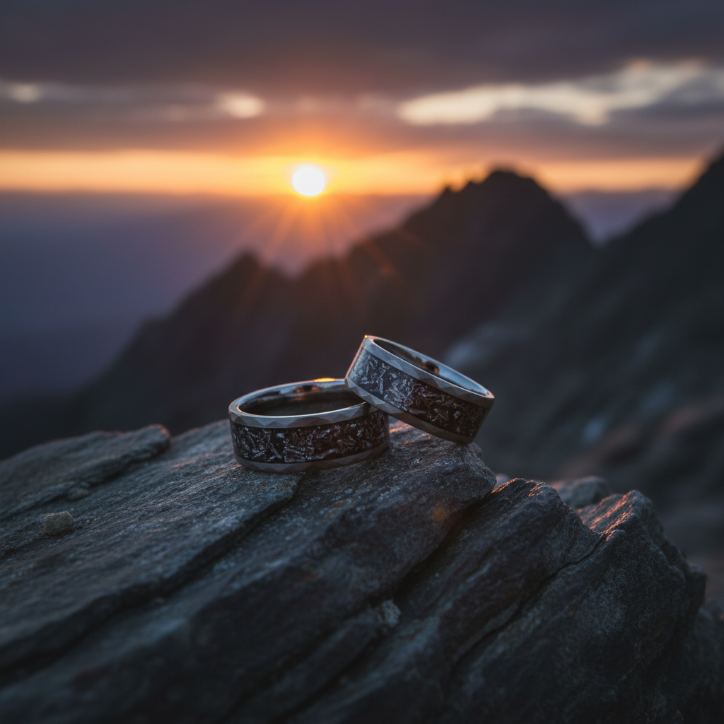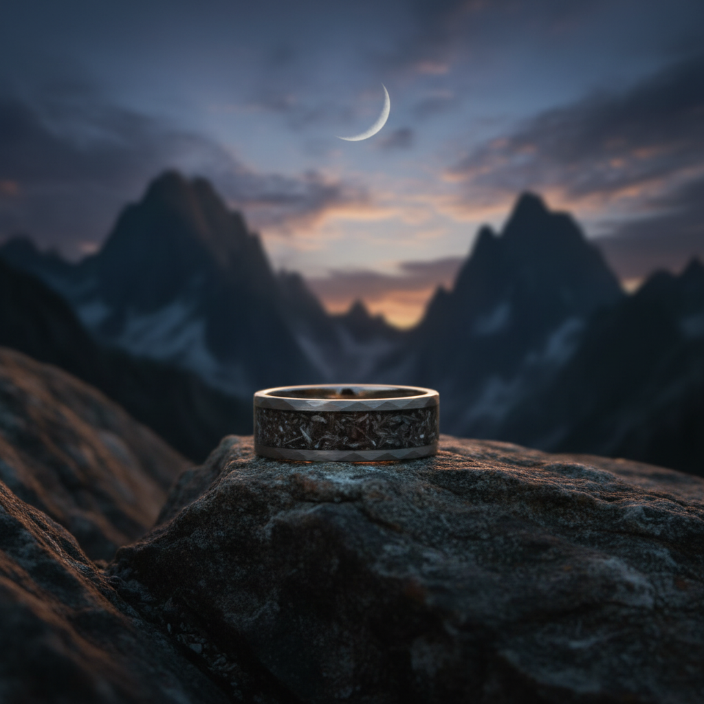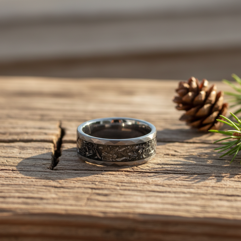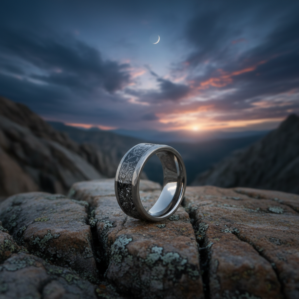 Crafted from premium tungsten, this meteorite ring delivers exceptional durability and scratch resistance. The flat profile design ensures comfortable all-day wear, while the engravable surface allows for personal customization. This alternative metal wedding band combines the wonder of space with practical everyday functionality.