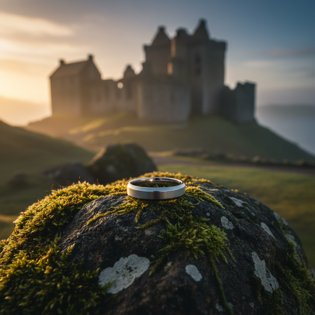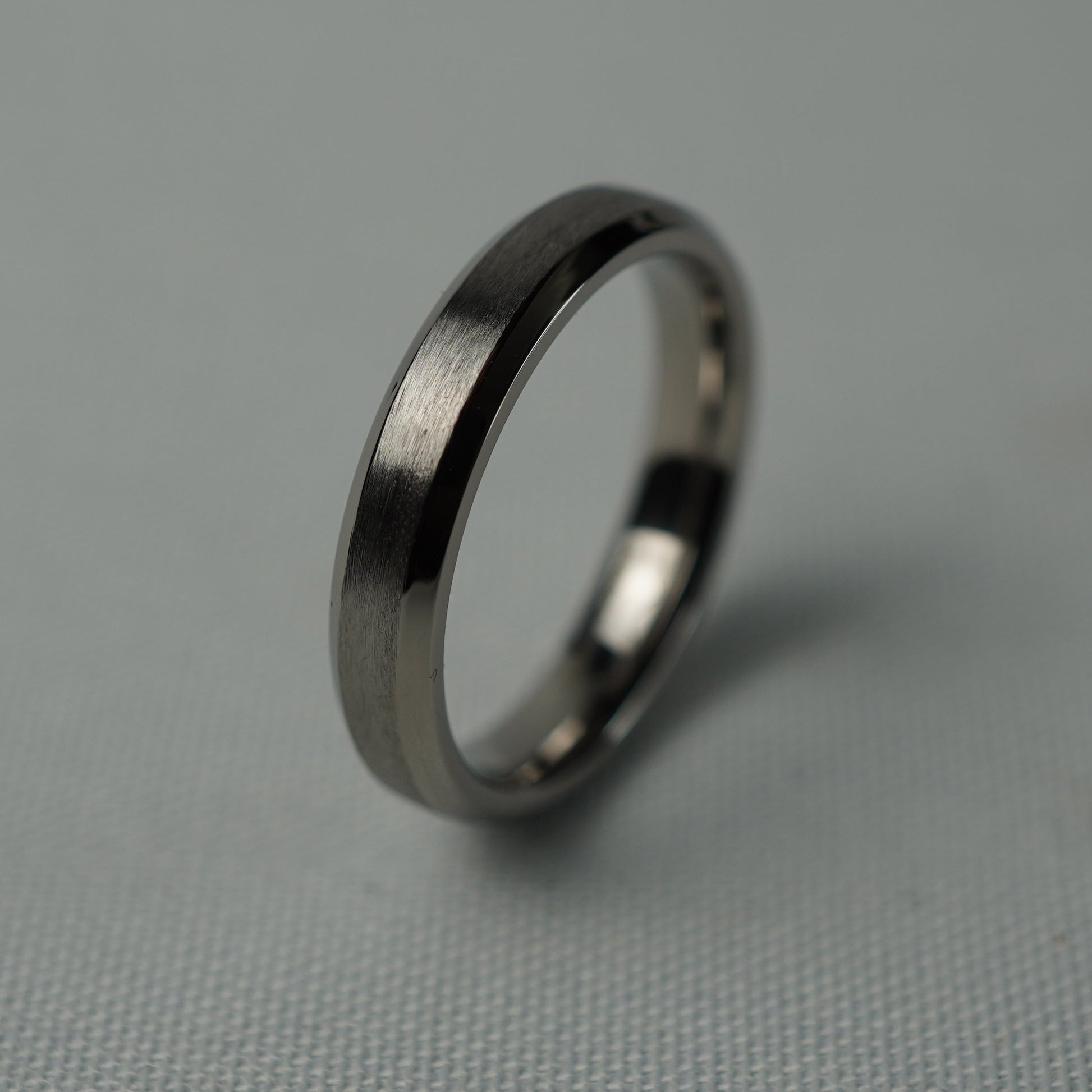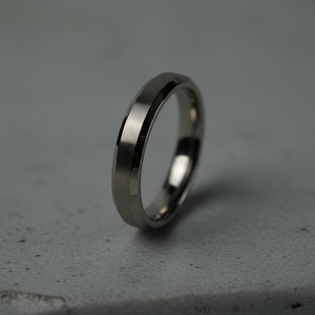 This ring features precision-bevelled geometry with mirror-polished edges contrasting against a brushed titanium centre. The dual-finish design requires careful machining to achieve clean transitions between surface treatments. Suitable for professional environments and active lifestyles requiring work-safe jewellery.