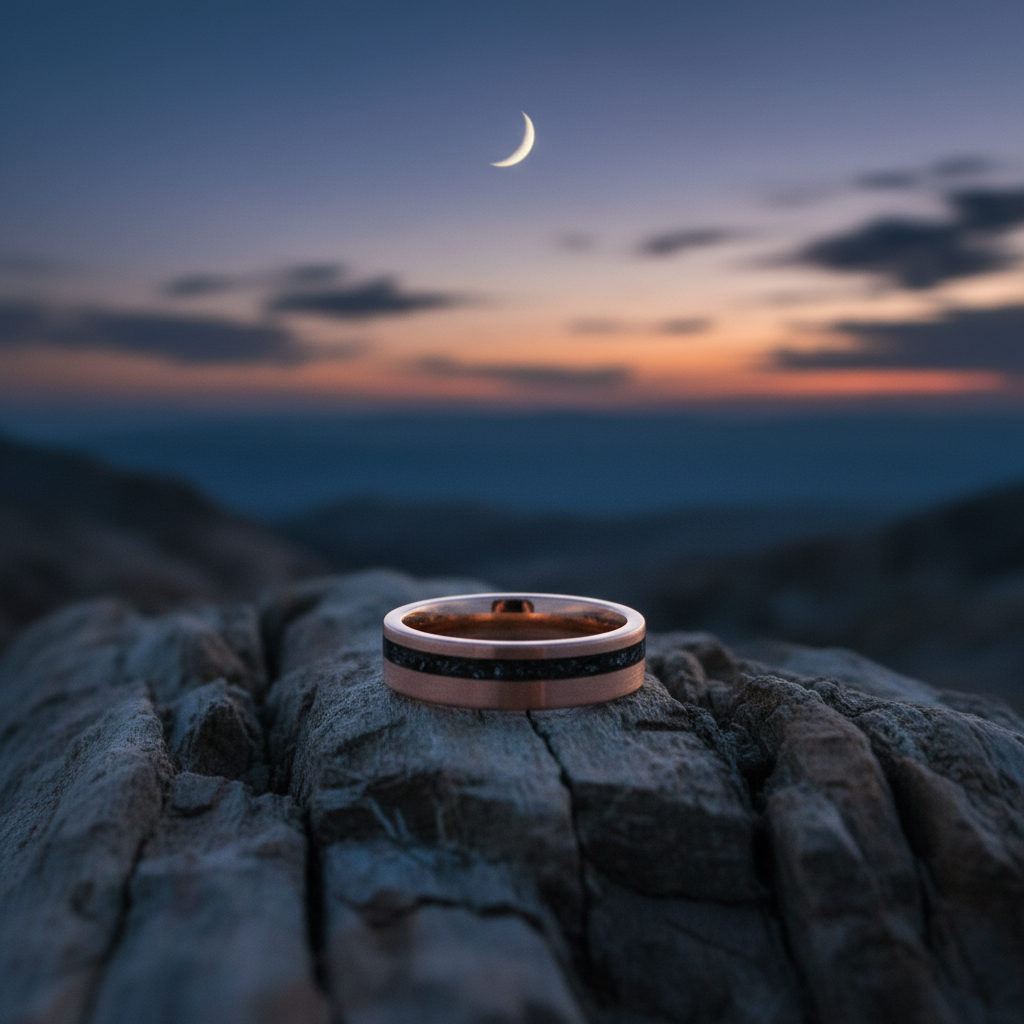This meteorite tungsten ring combines the durability of tungsten carbide with authentic space meteorite, creating a wedding band that represents strength and cosmic connection. The rose gold plating adds warmth to the flat profile design, while the meteorite inlay provides a one-of-a-kind pattern that makes each ring truly individual.