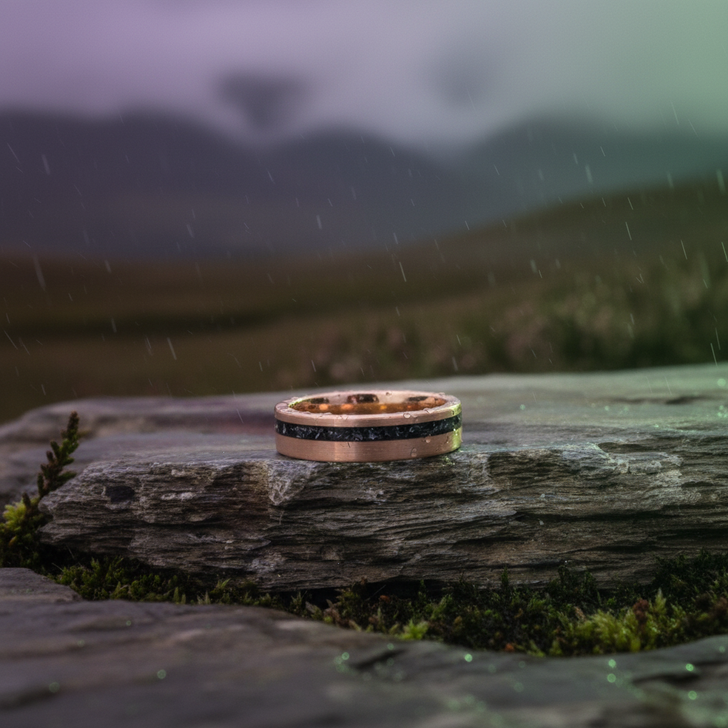 Our Apollo ring with a ring of meteorite is 6mm and rose gold plated tungsten. Making it a unique, special and different all in one ring.