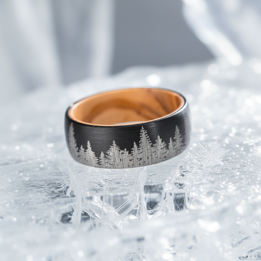 The Explorer combines the strength of tungsten carbide with the natural beauty of olive wood in an 8mm wedding band designed for those who appreciate the outdoors. This black tungsten ring features detailed tree engraving that wraps around the band, complemented by an authentic olive wood inlay.