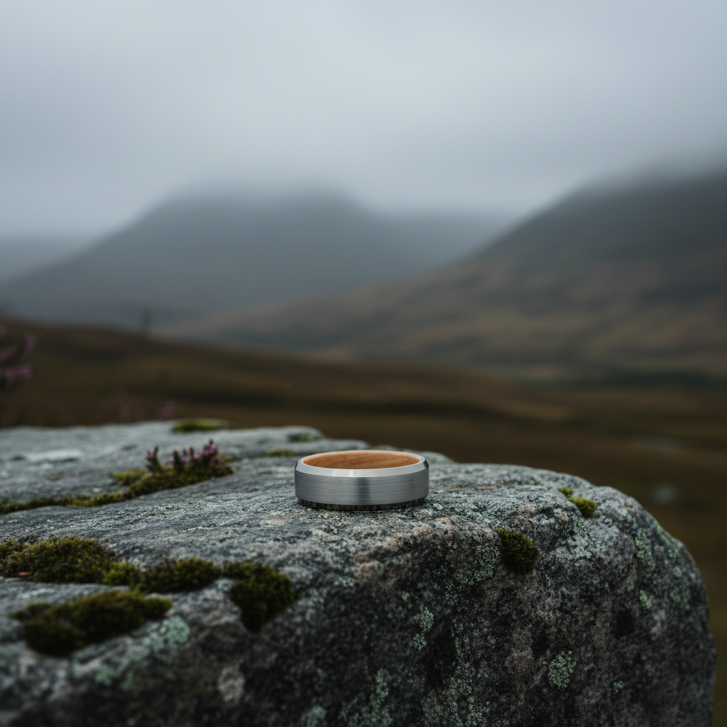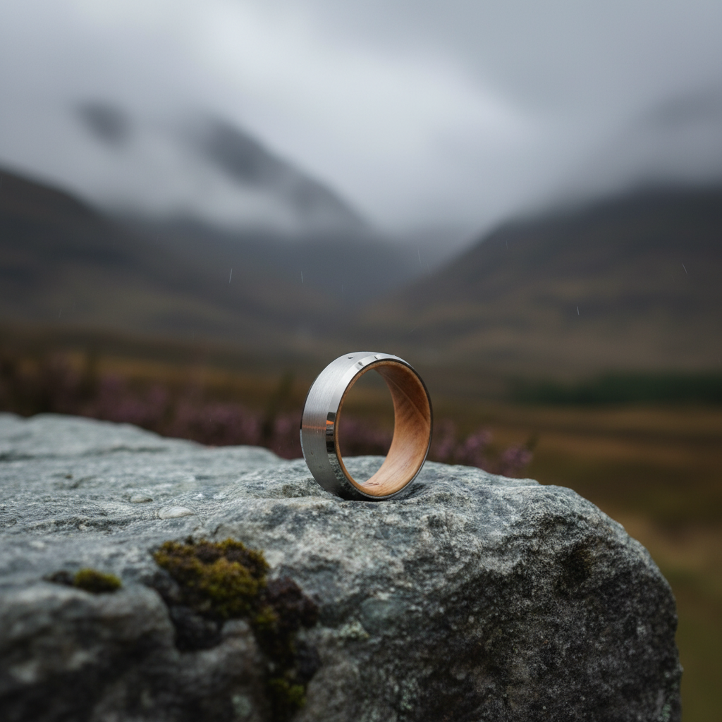 Where Scotland's finest traditions meet modern engineering. The Glencairn unites whisky barrel wood with aerospace-grade tungsten—creating a ring as rich in character as the spirits that once aged within.