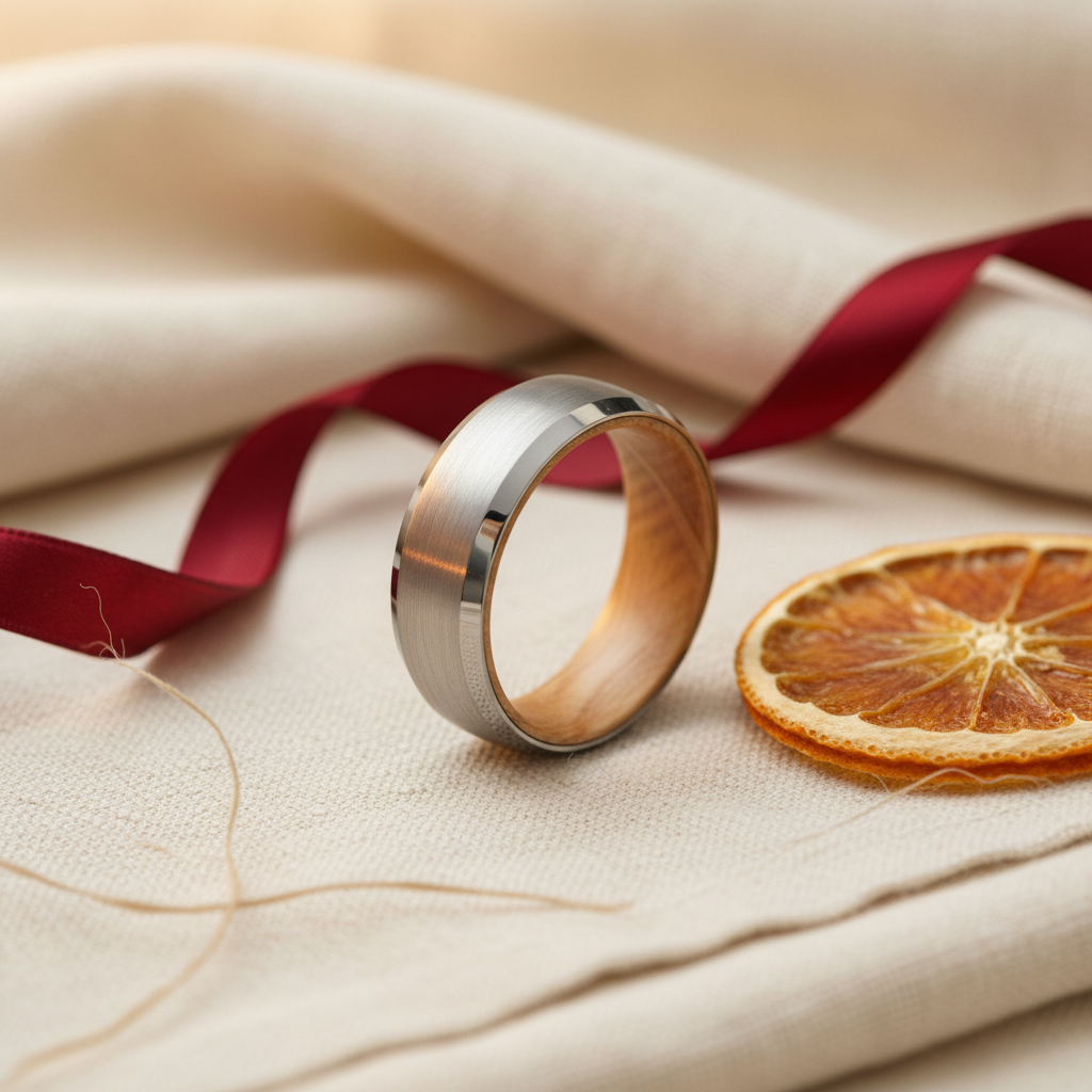 Tungsten's exceptional hardness protects the precious barrel wood while providing a weight and presence that feels substantial on your hand. The contrast is striking: industrial strength cradling organic heritage, modern permanence preserving ancient craft.