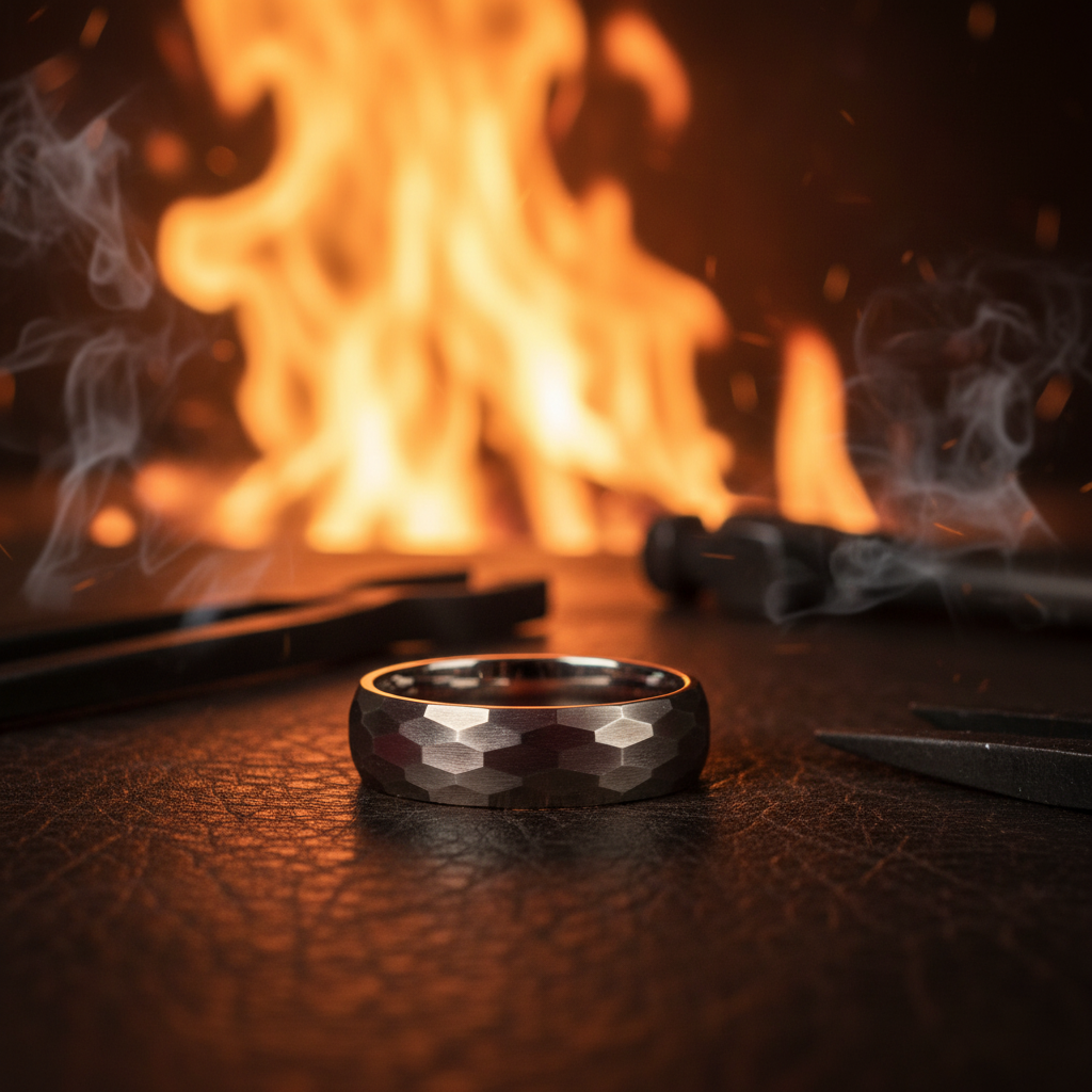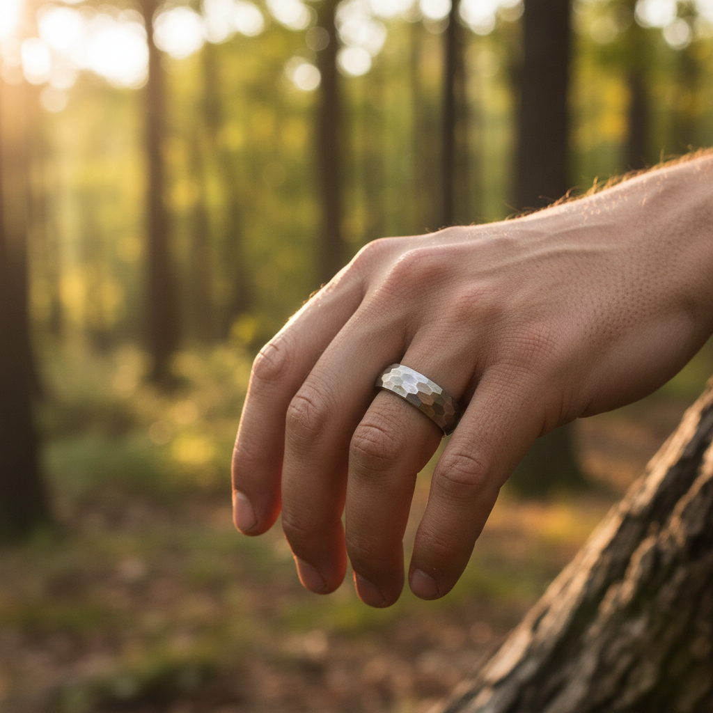 Crafted from aerospace-grade titanium, this 6mm band delivers exceptional durability without the weight of traditional metals. The hammered surface creates a unique geometric pattern that resists scratches and maintains its distinctive appearance through years of daily wear.