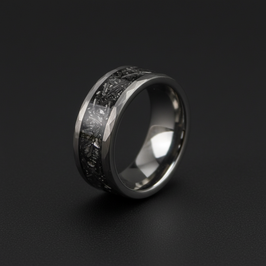 Crafted from premium tungsten, this meteorite ring delivers exceptional durability and scratch resistance. The flat profile design ensures comfortable all-day wear, while the engravable surface allows for personal customization. This alternative metal wedding band combines the wonder of space with practical everyday functionality.