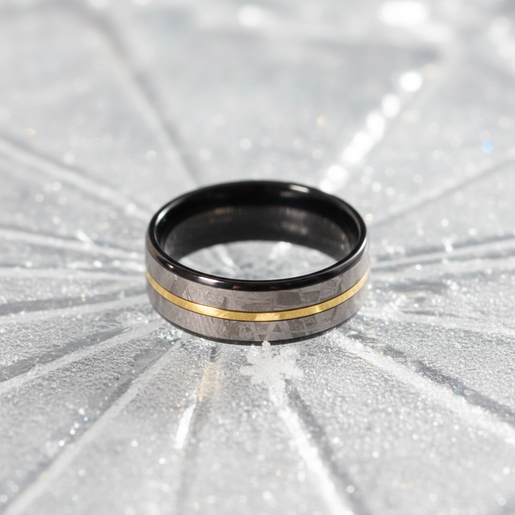 This handcrafted wedding band features a sophisticated double-inlay design with genuine meteorite and black zirconium. The gold-plated steel construction ensures durability while maintaining the luxury aesthetic of this 8mm flat profile ring.