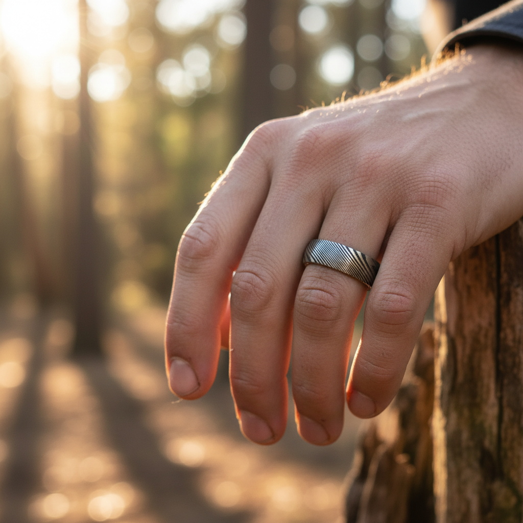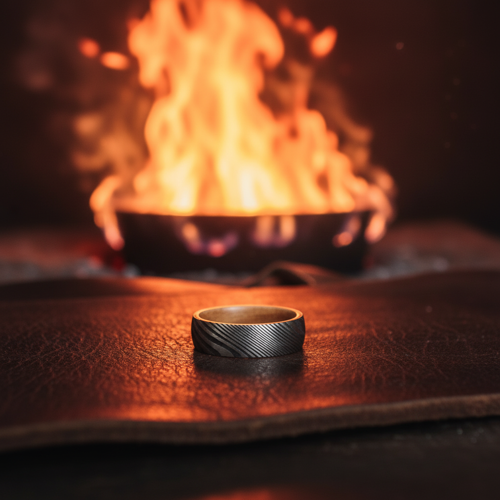 This handcrafted Damascus steel ring combines traditional metalworking techniques with premium whisky barrel wood for a distinctive wedding band that stands apart from conventional rings.