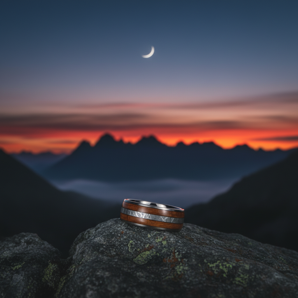 Titanium construction ensures the ring maintains its shape and finish through regular use. The meteorite inlay is sealed to prevent oxidation while preserving its distinctive patterns. Wood inlay is stabilized and protected with durable coating to withstand moisture and wear.