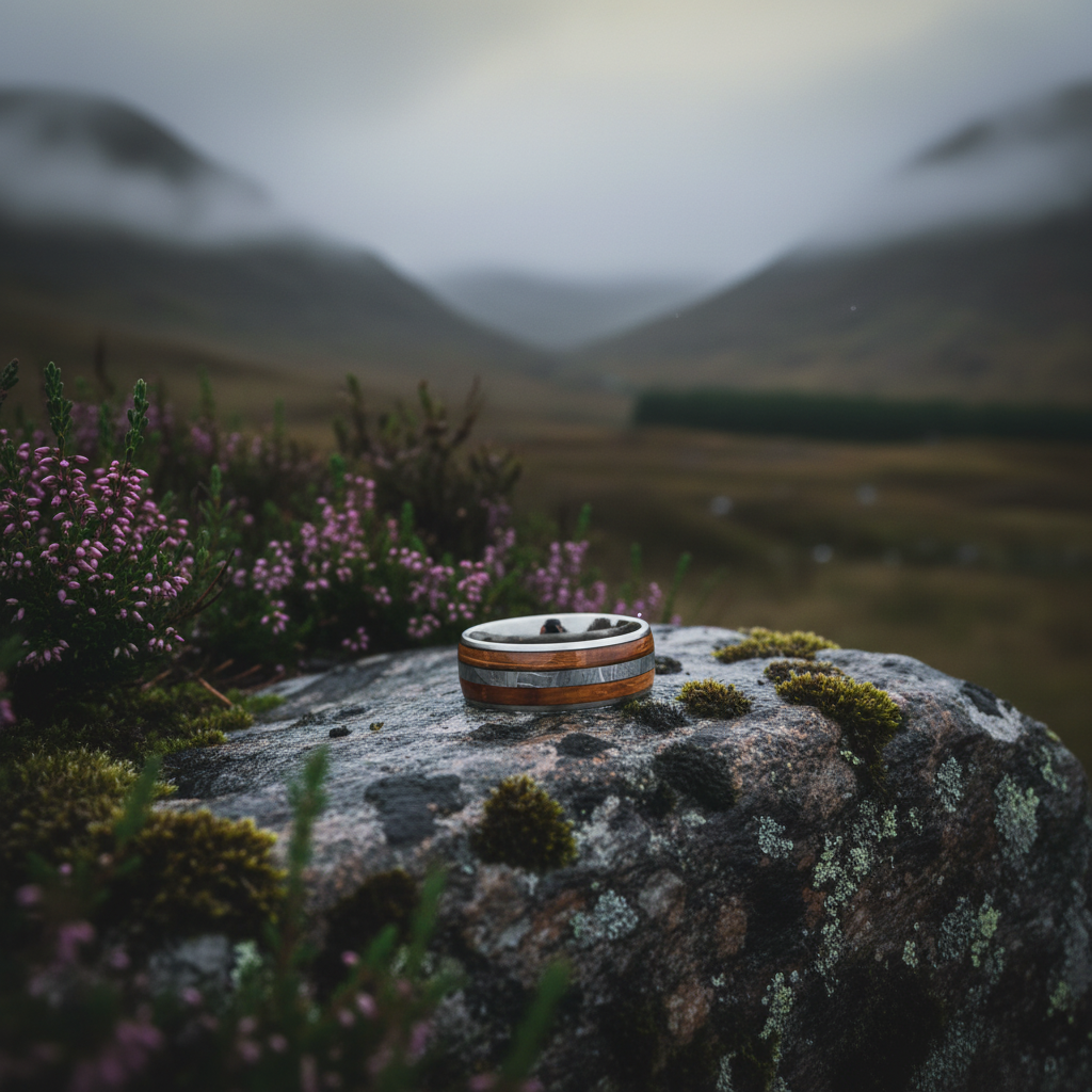 Ideal for grooms, wedding bands, anniversary gifts, or anyone seeking a ring that tells a story through its materials. The combination of space-born meteorite and earth-aged whisky barrel wood creates a meaningful piece that represents both cosmic history and Scottish tradition.