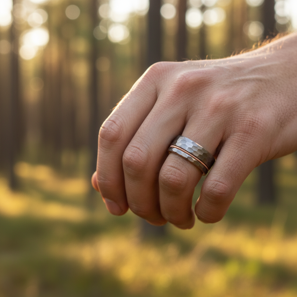 Looking for something that’s rougher but also features your love of music? Look no further, we are proud to stock this incredible ring of 8mm hammered tungsten, gold plated inlay and guitar string accent.