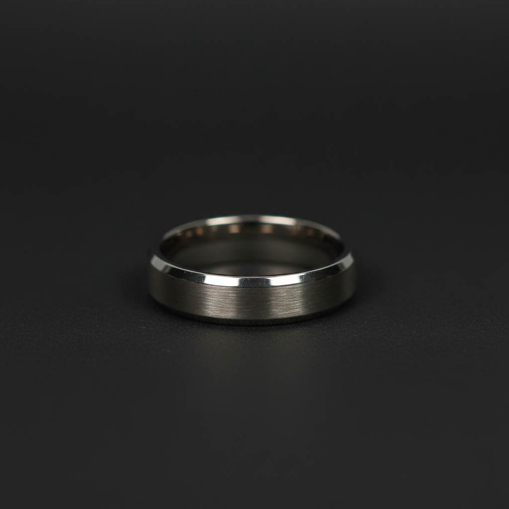 This ring features precision-beveled geometry with mirror-polished edges contrasting against a brushed titanium center. The dual-finish design requires careful machining to achieve clean transitions between surface treatments. Suitable for professional environments and active lifestyles requiring work-safe jewelry.