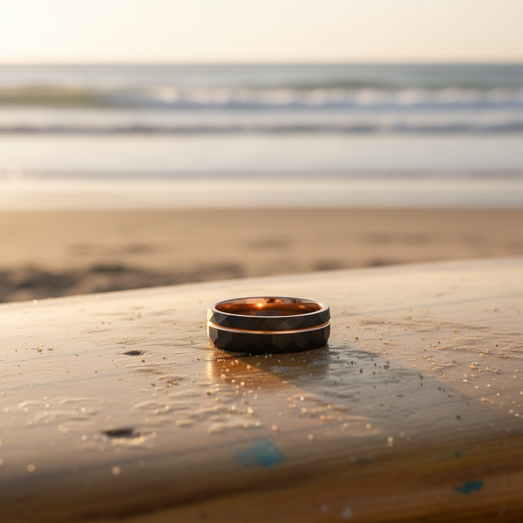 The Bonnie is a beautiful rose gold plated tungsten ring with 6mm width. This wedding band combines subtle shine with a rugged exterior design, offering the perfect balance of elegance and durability. The tungsten construction ensures long-lasting wear while the rose gold plating provides a sophisticated finish.