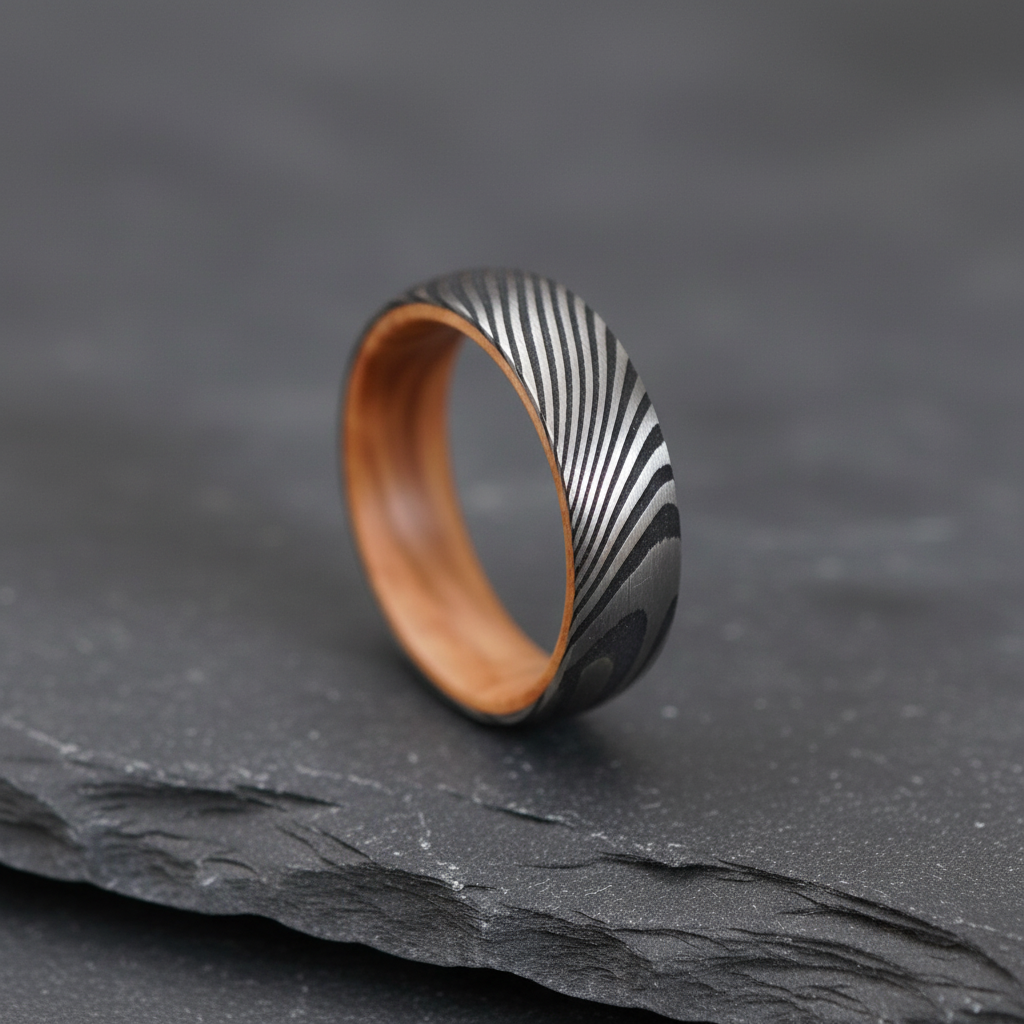 This handcrafted Damascus steel ring combines traditional metalworking techniques with premium whisky barrel wood for a distinctive wedding band that stands apart from conventional rings.