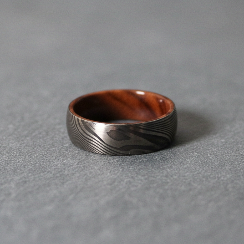 Wanted something unique, damascus steel well k own for always having different designs, twinned with the rosewood inside gives a gorgeous ring
